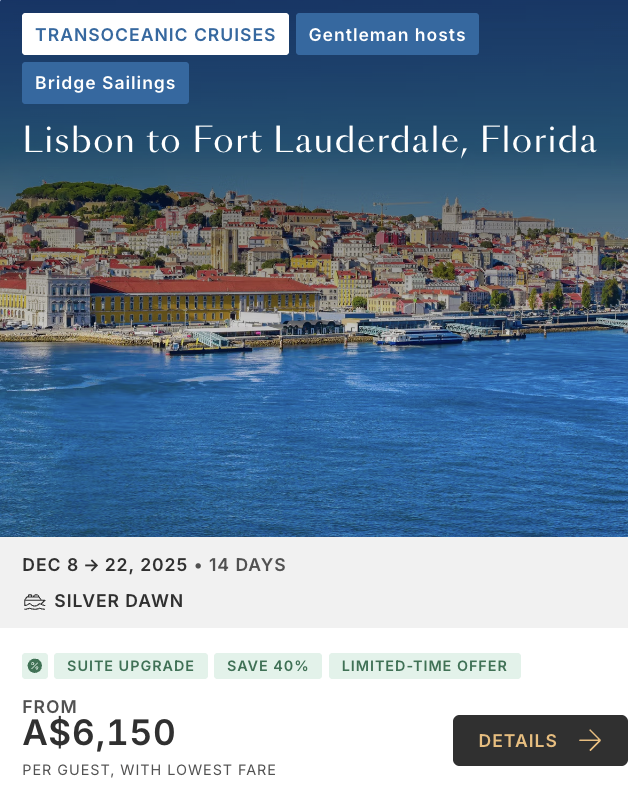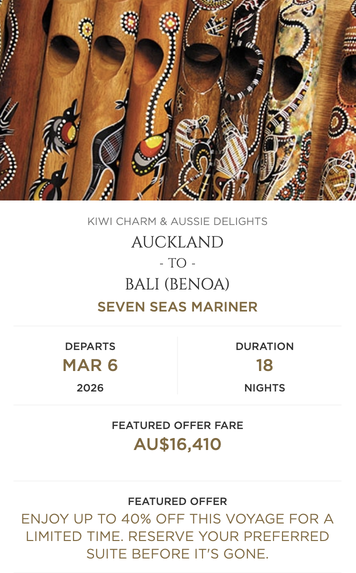 40% off, plus a FREE 2-Category Suite Upgrade on select sailings and suites